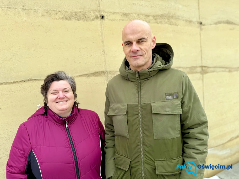 Maria Wróbel i Łukasz Oleksy przy ścianie wykonanej z ziemi. Fot. Jola Wodniak