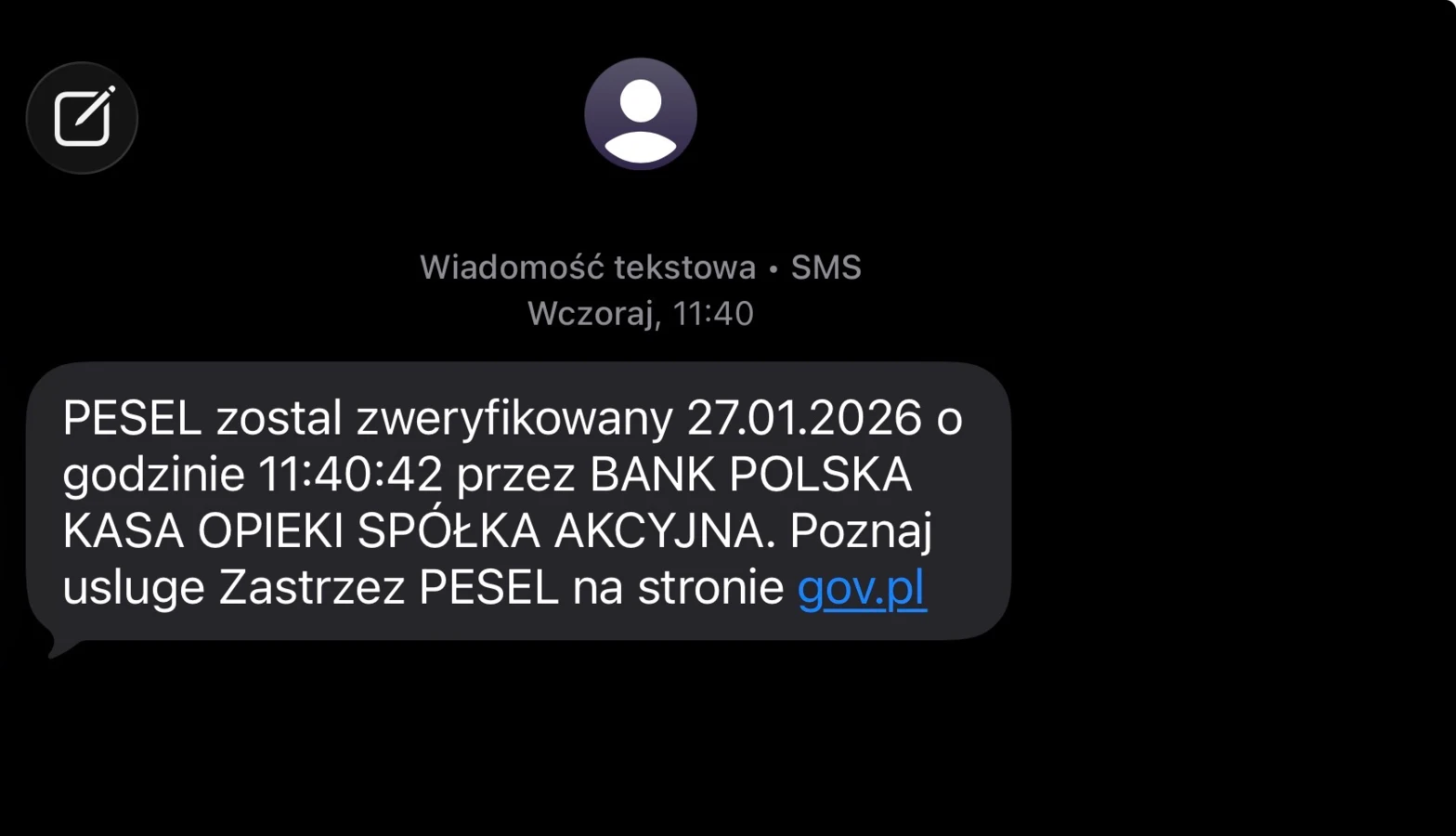 SMS zawiera informację, że bank pozytywnie zweryfikował numer PESEL adresata. Sugeruje, że na ten czas PESEL nie był zastrzeżony. Dlatego też w wiadomości znajduje się link i instrukcja, by ponownie zastrzec numer właśnie przy jego pomocy.