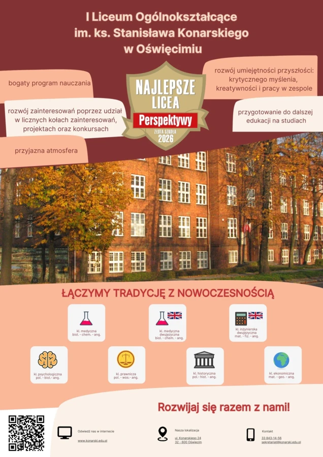 „Jeśli zastanawiasz się, gdzie kontynuować naukę, przyjdź do Konara i przekonaj się, że warto” - zaprasza społeczność I Liceum Ogólnokształcącego im. ks. Stanisława Konarskiego w Oświęcimiu.