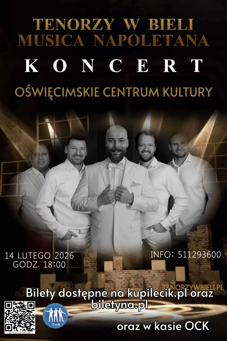 14 lutego 2026 roku o godzinie 18:00 w Oświęcimskim Centrum Kultury wystąpią Tenorzy w Bieli w koncercie „Musica Napoletana”.