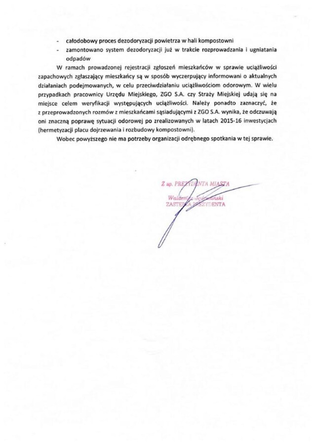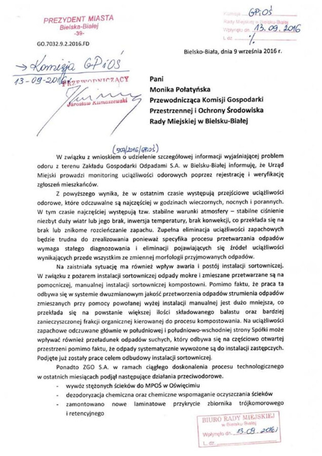 Ponadto członkowie Stowarzyszenia „Stop fetorowi w mieście i gminie Oświęcim” dotarli do pisma, jakie Waldemar Jędrusiński, zastępca prezydenta Bielska-Białej, skierował do Małgorzaty Połatyńskiej, przewodniczącej Komisji Gospodarki Przestrzennej i Ochrony Środowiska Rady Miejskiej w Bielsku-Białej.