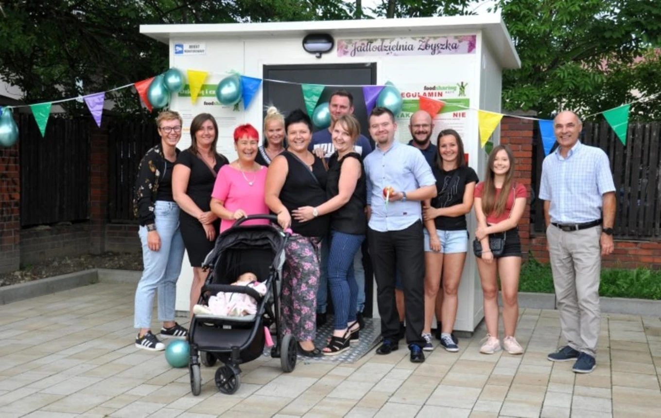 Wewnątrz białego budynku znajduje się duża lodówka, a obok półka na produkty, które nie wymagają schłodzenia. Całość zgodna jest z wymogami Foodsharing Polska. Jest też podjazd dla wózków, by miejsce dostępne było dla każdego.