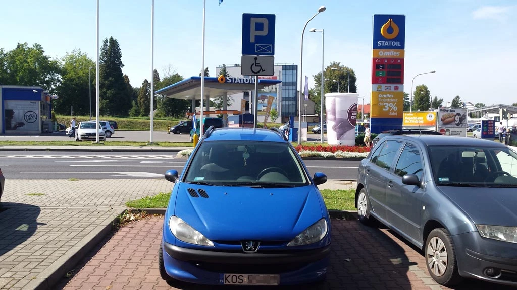 Tak właśnie na ulicy Nojego w Oświęcimiu zaparkował kierowca niebieskiego peugeota.
