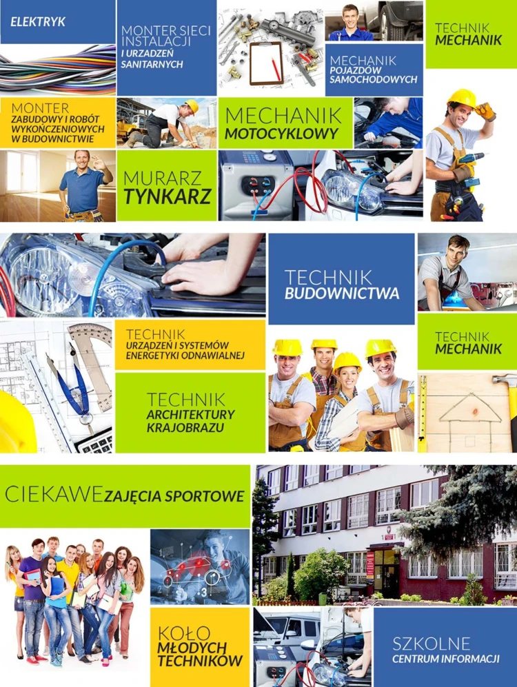 Każdy z przyszłych techników budownictwa, architektów krajobrazu i techników urządzeń i systemów energetyki odnawialnej, mechaników i elektromechaników samochodowych i motocyklowych oraz ślusarzy i monterów znajdzie dla siebie ważne informację o zawodzie i ofercie kształcenia.