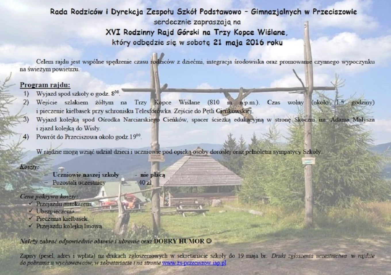 Zapraszamy na XVI Rodzinny Rajd Górski na Trzy Kopce Wiślane, który odbędzie się w sobotę 21 maja. Wyjazd przewidziany jest z Przeciszowa o godzinie 8.