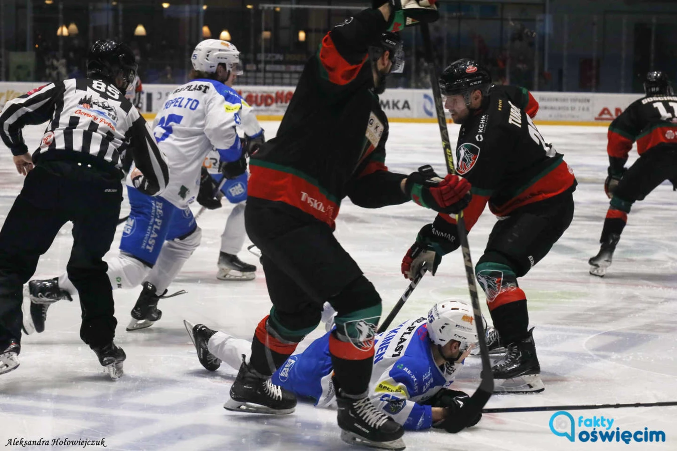 Pierwsza tercja nie przyniosła goli, choć pod bramką Tomasa Fucika było gorąco zwłaszcza pod koniec otwierającej odsłony. Co się jednak odwlecze... Na początku drugiej tercji atomowym uderzeniem pod poprzeczkę popisał się Mark Kaleinikovas i wprawił w stan euforii oświęcimskie trybuny. Tyszanie odpowiedzieli w 35 minucie. Linusa Lundina strzałem w „okienko" zaskoczył Christian Mroczkowski. Cała zabawa rozpoczynała się zatem od początku. Biało-niebiescy kapitalnie rozpoczęli trzecią tercję. Już po 13 sekundach po wznowieniu gry przy przeciwległym słupku trafił ...jeden z nominowanych w 89. plebiscycie na „Najlepszego Sportowca 2023 roku". Krystian Dziubiński, bo oczywiście o nim mowa, jak się później okazało rozstrzygnął losy „świętej wojny".A propos wspomnianego plebiscytu