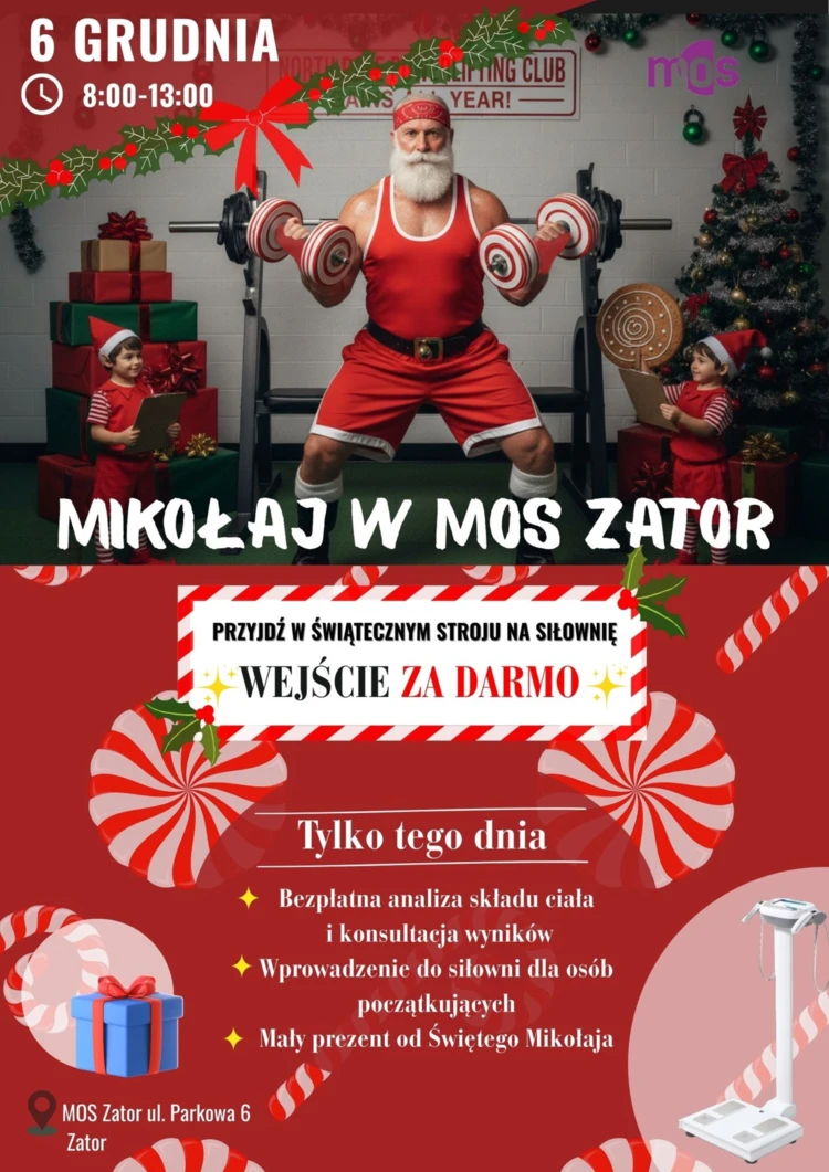 MOS w Zatorze zamieni mikołajkowy poranek w świąteczny trening z darmowym wejściem, analizą składu ciała i prezentami dla ćwiczących.