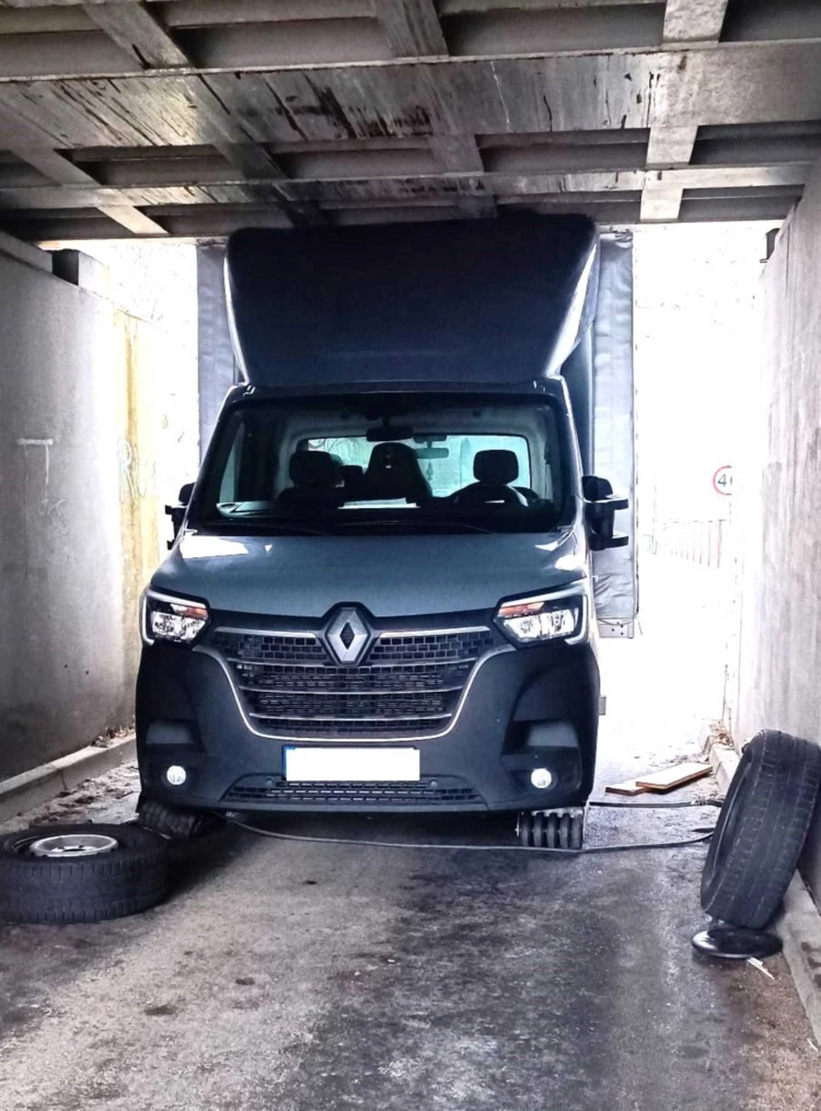 Kierowca dostawczego renault zignorował znak informujący, że pod wiadukt kolejowy mogą wjechać samochody do 2,5 metra wysokości.